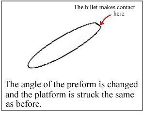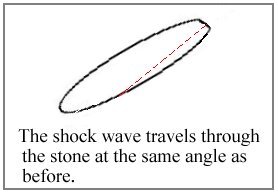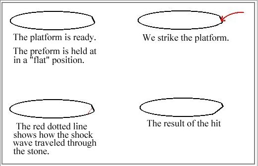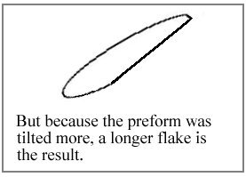 Well, the flake came off. And as you can see, we ended up with a rather shallow result. If we continue hitting our platforms with the preform held at this angle, it will get smaller and stay thick. We will get points that look like "turtle backs." This won't do, will it? Well, let's change the angle we hold the preform at and see what happens. In the illustrations below we take the same preform we had before and start over. The angle of the strike is exactly the same as before. The resulting shock wave is at exactly the same angle as in the first example as well. The only thing different is, this time we're going to change the angle at which the preform is being held. Let's see what happens.